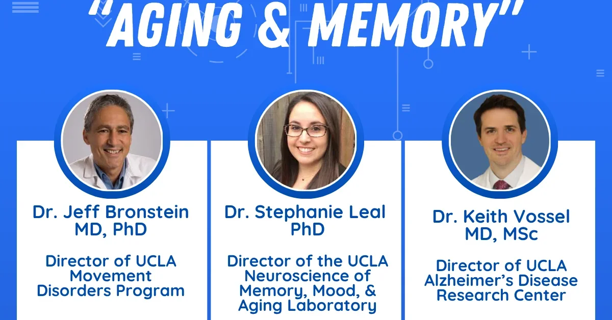 The evening will feature 3 guest speakers: Dr. Jeff Bronstein (Director of UCLA Movement Disorders Program), Dr. Stephanie Leal (Director of  UCLA Neuroscience of Memory, Mood, and Aging Lab), and Dr. Keith Vossel (Director of UCLA Alzheimer’s Research Center).